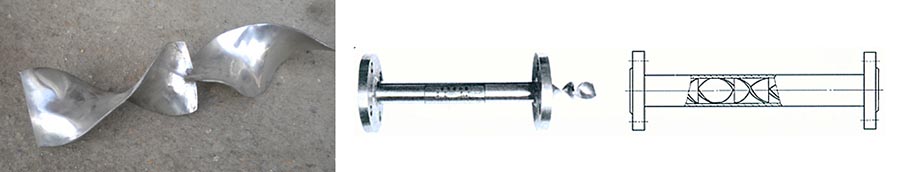 SK單元由單孔道左、右扭轉(zhuǎn)的螺旋片組焊而成,它的技術(shù)性能:最高分散程度≤10 u m,液—液、液—固相的不均勻度系數(shù)為α√ x≤1-5%。