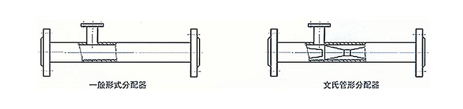 適用于二股或二股以上流體進(jìn)料,當(dāng)主流與次流壓力不平衡時(shí)選用文氏管形分配器, 當(dāng)主流與次流壓力平衡時(shí)選用一般形式分配器。